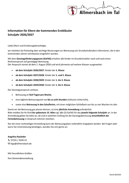 Informationen & Anmeldung Klasse 1 Kernzeit 2026/2027