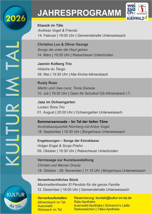 Kultur im Tal ist eine bürgerschaftliche Initiative, die seit 2023 ehrenamtlich für die Gemeinden Allmersbach im Tal, Auenwald und Weissach im Tal arbeitet.